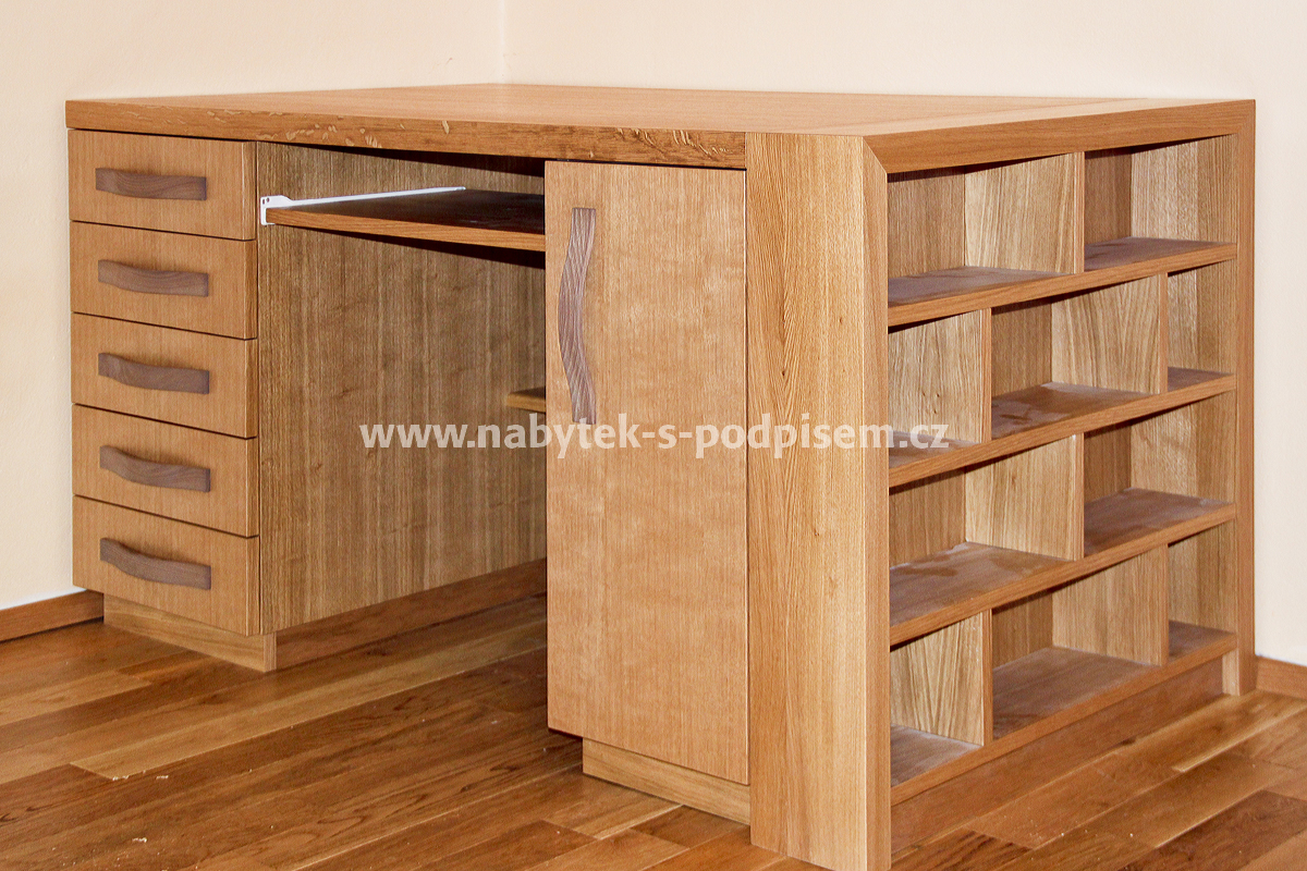 Pracovní stůl - dub masiv a dýha, z boku ukládání CD